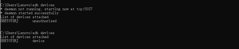 允许来自电脑的 USB 调试之后,在电脑上输入