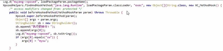 }- 用途: 监控通过Runtime.exec执行命令数组的行为,检测是否有执行su命令的尝试