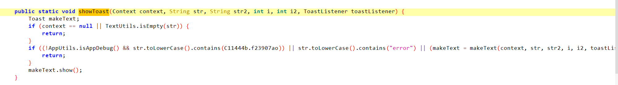 我们发现 该Toast弹出shoeToast 和我们弹出堆栈一致 CustomToast.showToast(WelcomeActivity.**this**.mContext,WelcomeActivity.**this**.getString(R.string.root_toast), 100);